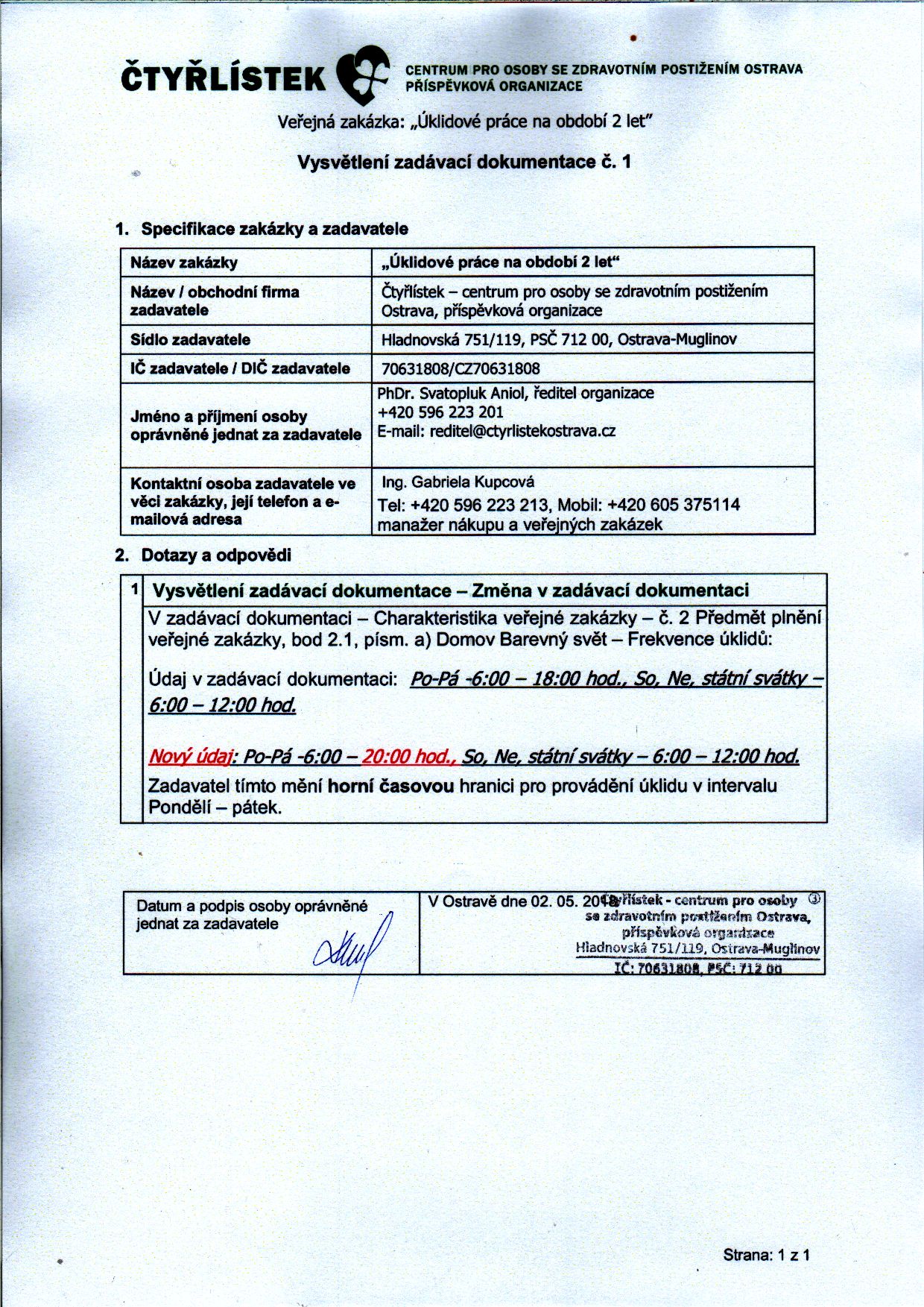Dobrý den, upozorňuji tímto, že bylo zveřejněno Vysvětlení ZD č. 1. Ing. Gabriela Kupcová manažer nákupu a veřejných zakázek